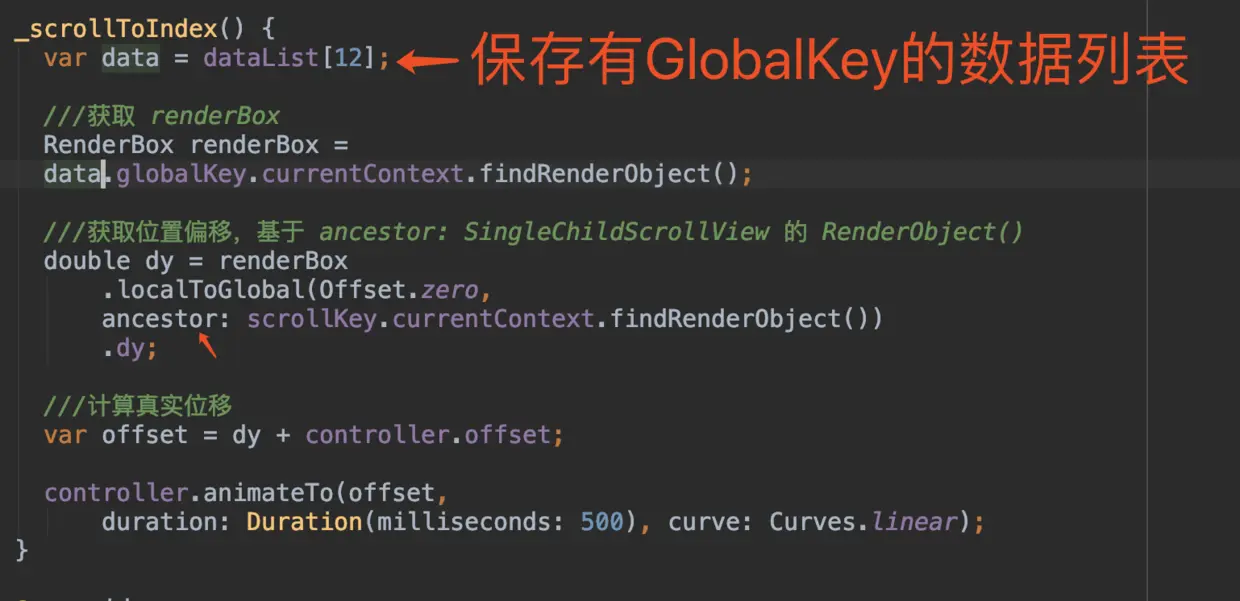 上图为部分代码,完整代码可见 scroll_to_index_demo_page2.dart ,这里主要是给每个 item 都赋予了一个 GlobalKey , 利用 findRenderObject 找到所需 item 的 RenderBox ,然后使用 localToGlobal 获取 item 在 ViewPort 这个 ancestor 中的偏移量进行滚动: