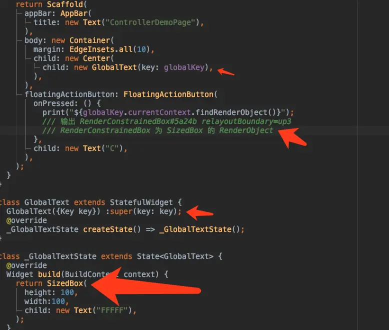 所以如下代码所示,print("${globalKey.currentContext.findRenderObject()}"); 最终输出了 SizedBox 的 RenderObject 。