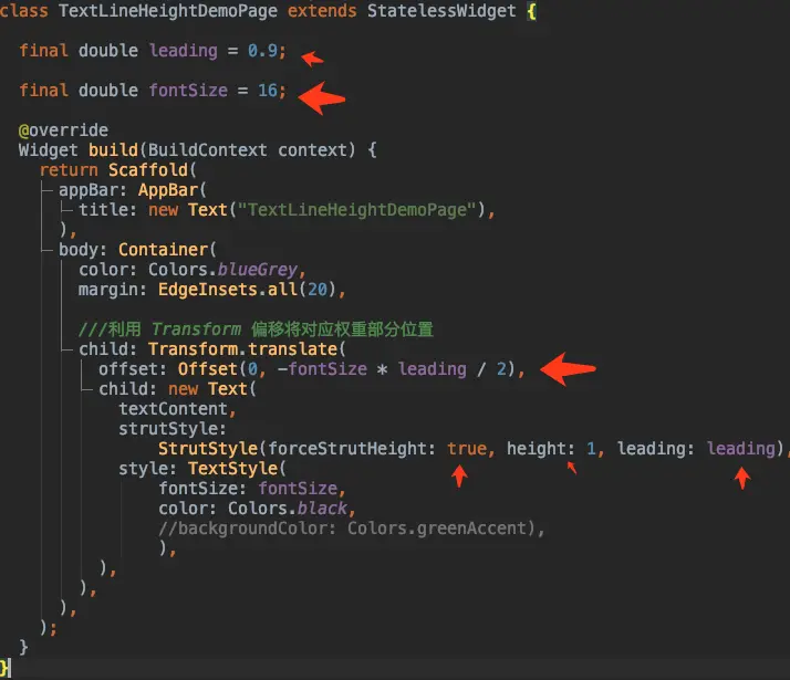 那么我们应该如何处理行间距呢?如下图所示,通过设置 StrutStyle 的 leading , 然后利用 Transform 做计算翻方向位置偏移,因为 leading 是上下均衡的,所以计算后就可以得到我们所需要的行间距大小。 (虽然无法保证一定 100%像素准确,你是否还知道其他方法?)
