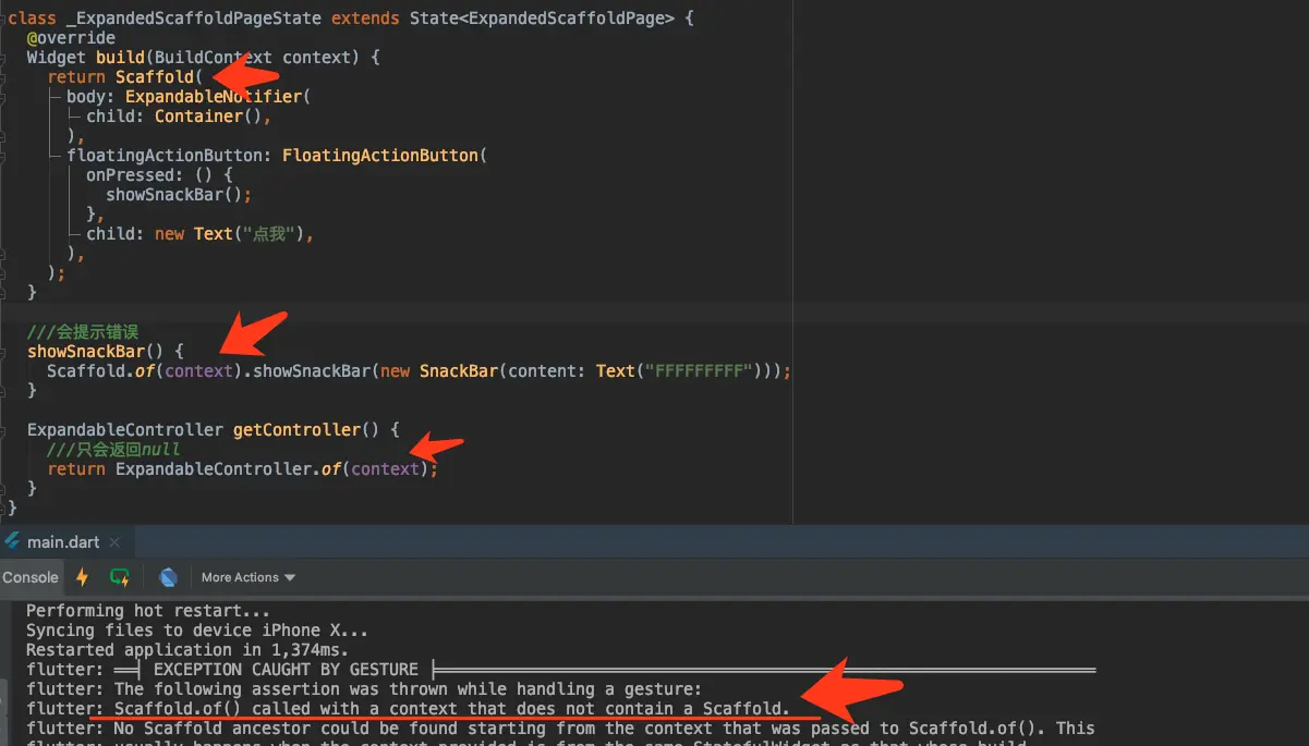 如下图所示,相信一些 Flutter 开发者在使用 Scaffold.of(context).showSnackBar(snackbar) 时,可能 遇到过如下错误,这是因为传入的 context 属于错误节点导致的,因为此处传入的 context 并不能找到页面所在的 Scaffold 节点。