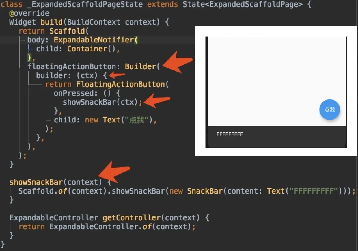 所以这时候 Builder 的作用就体现了,如下所示,通过 builder 方法返回赋予的 context ,在向上查找 Scaffold 的时候,就可以顺利找到父节点的 Scaffold 了,这也一定程度上体现了 ComponentElement 的作用之一。