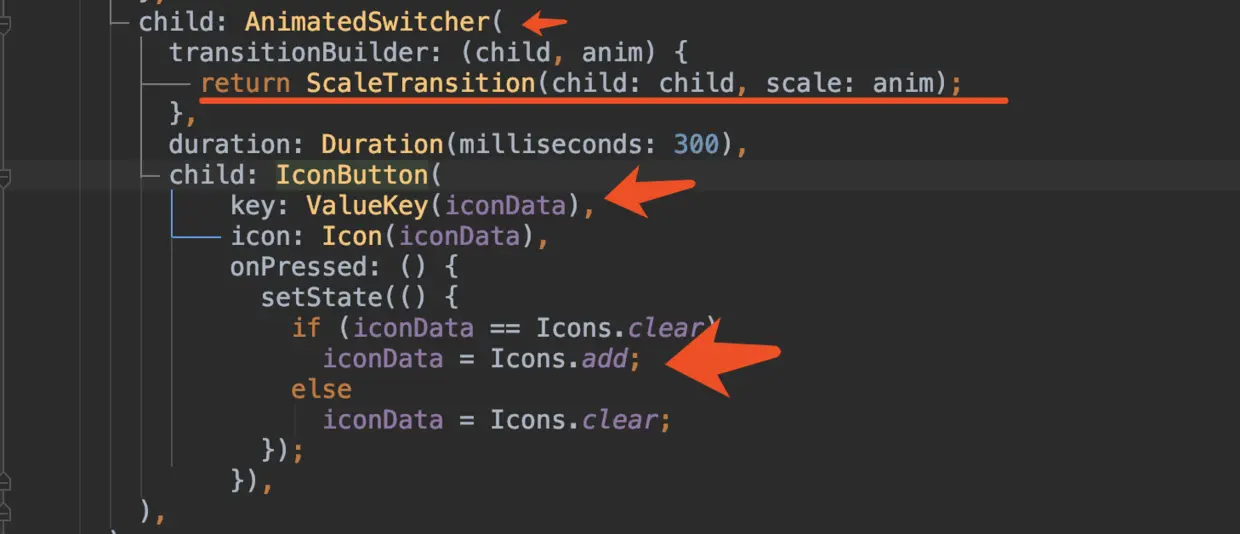 如下图所示,通过嵌套 AnimatedSwitcher ,指定 transitionBuilder 动画效果,然后在数据改变时,同时改变需要执行动画的 key 值,即可达到动画切换的效果。