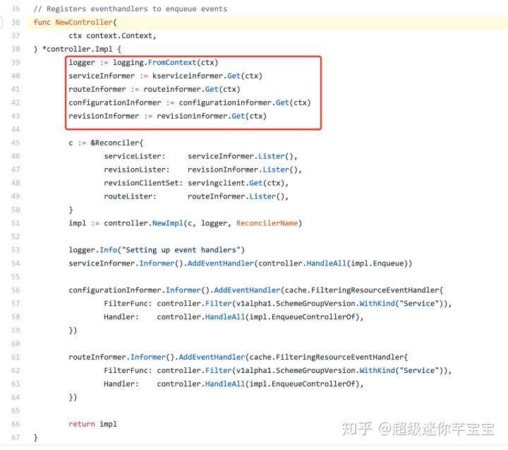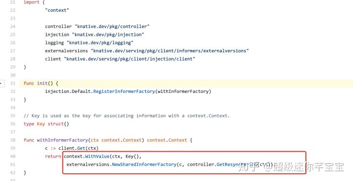 在 Context 的这些特性中,Knative Serving 中重度依赖的是 Value 功能。以 Service 的 Informer 初始化为例进行说明,这里可以看到源码。