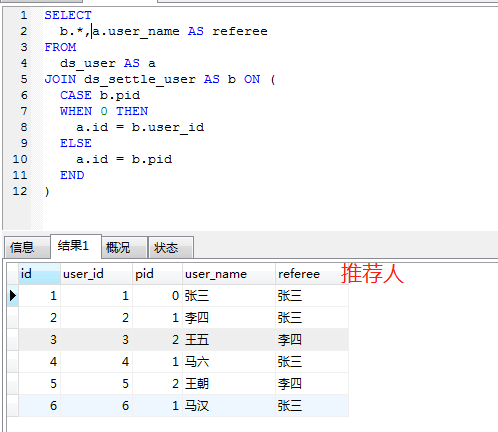需求:当pid的值为0是推荐人为自己,需要执行查询条件ds_settle_user表user_id等于ds_user表id链表查询,当pid不等于0是查询ds_settle_user表pid等于ds_user表id