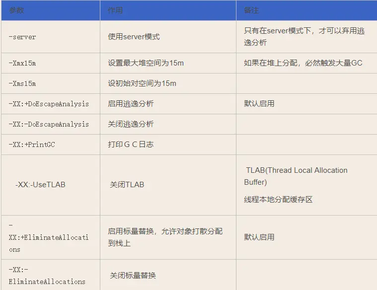 -server -Xmx15m -Xms15m -XX:-DoEscapeAnalysis -XX:+PrintGC -XX:-UseTLAB -XX:+EliminateAllocations