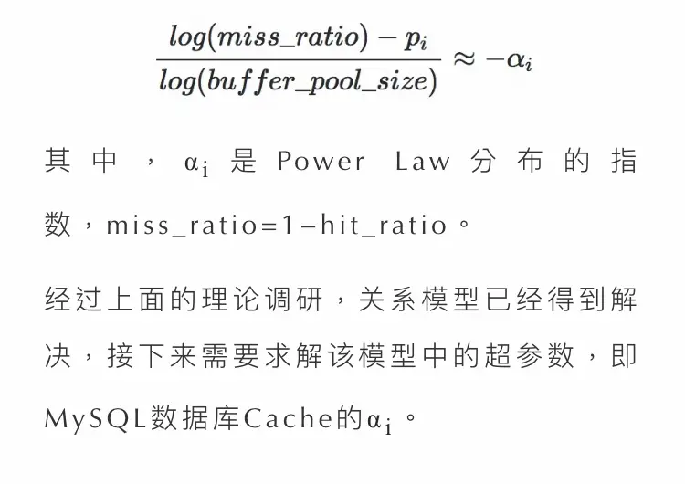 经过调研,我们发现在操作系统的Cache研究领域中,研究者已经对buffer size和hit ratio的对应关系有了很多研究,其中有研究表明在数据长尾部分这二者的关系服从Power Law分布,即: