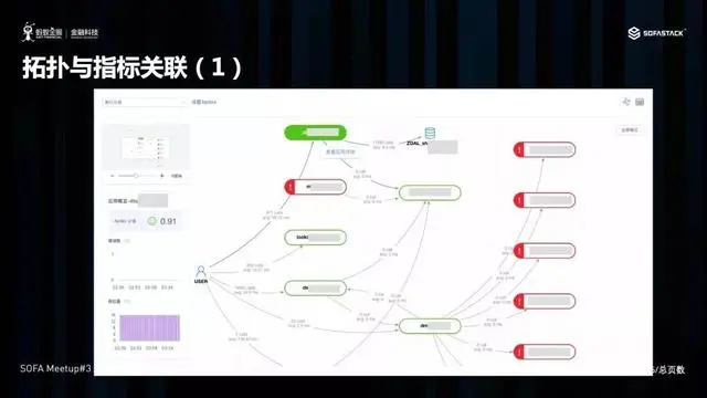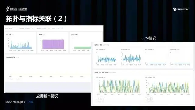 除了链路与日志关联,我们 SOFA 还提供了应用指标的上传功能 在应用上传 Trace 的同时,我们将指标与调用拓扑进行了关联,用户可以点击应用拓扑中的应用,下转查看响应的拓扑指标。