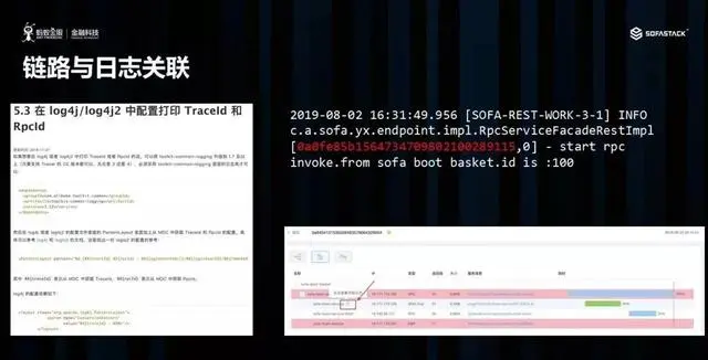 为此,我们提供了一个 SDK,用户可以根据我们官网上的配置,对 log4j 及其他 logger进行配置后,将 TraceId 及 RPCId 从 Tracer 中进行获取,那么在打印的日志的时候,TraceId , RPCId 也会如图上所示,在日志中打印出来。最后,然后通过Trace view,就能在查看链路的同时查看关联的日志。