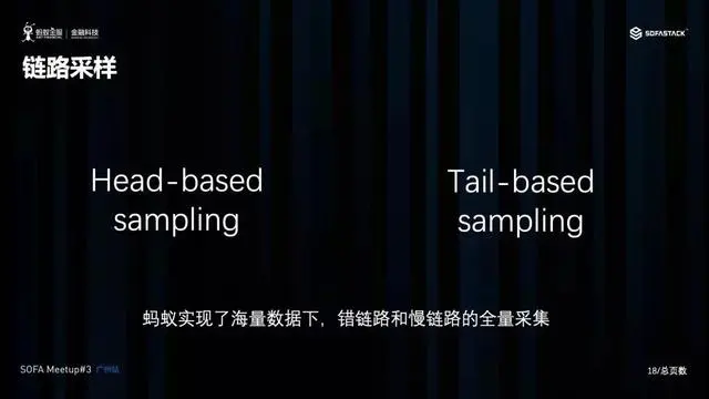 我们在蚂蚁金服内部,使用的是 Tail-based 的采样方案,简单来说,我们会把所有的 Span 数据,都会放到内存里,但这个时候,并不能决定具体那一条链路是采集还是不采集,但是当整条链路闭合后,我们就会对整条的 Trace 根据规则进行判断,如果有调用失败,或者整个调用中有部分 Span 是处于缓慢状态的,系统会将会标记此链路为异常链路,即命中采样,永久保存。这样就能保证运维人员能够无视采样率,具备对异常链路进行查看能力。由于对某一条链路数据是否采集的决定,其实是处于链路的尾部(非严格意义)才作出的,所以叫 Tail-based 采样。