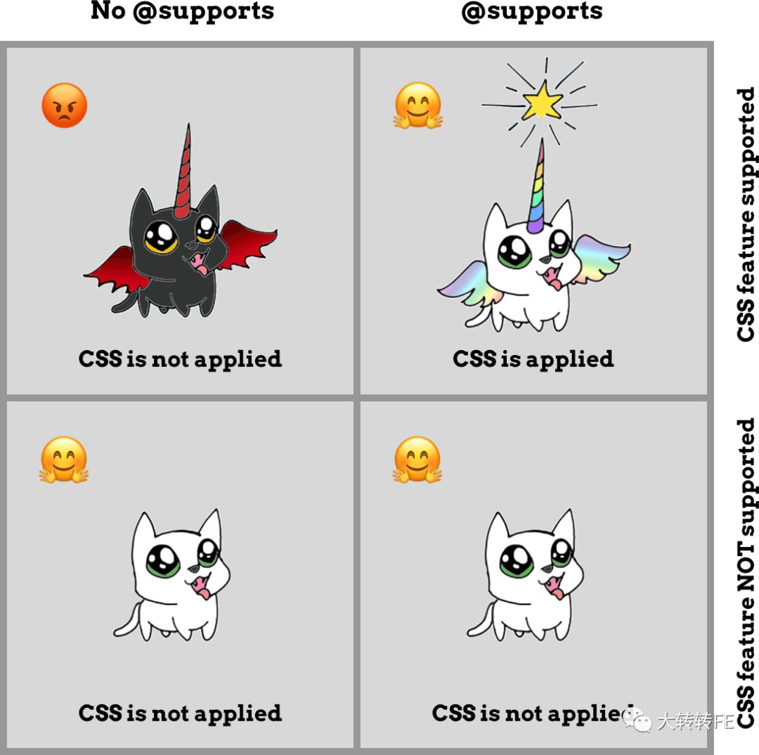 设计该功能的动机是允许作者在浏览器支持时使用新特性编写样式,同时在不支持的情况下优雅降级。即使CSS本身已经允许优雅降级,例如只要不破坏样式表中的其它样式,忽略不支持的属性值即可。但有时我们需要更多的东西。