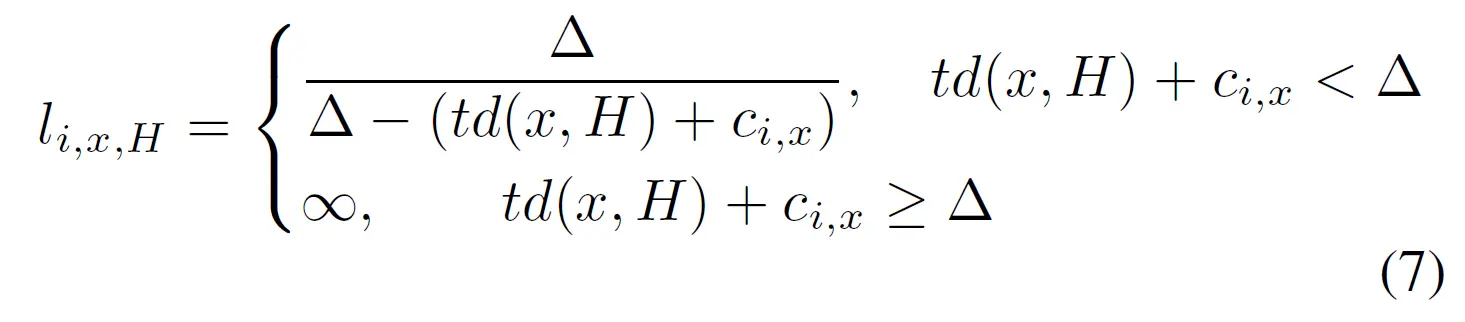 是任务i的最差任务执行时间WCET,基于需要传输的延迟、带宽和数据量得到;Δ是截止期限。总延迟越接近任务的截止期限,惩罚就越高。