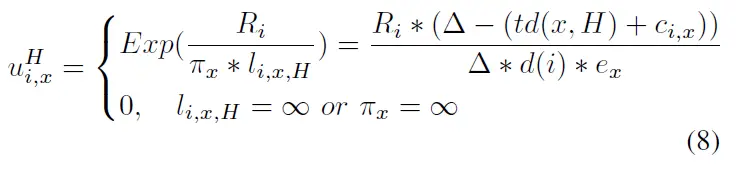 EXP是期望回报,是原始收益除以由于打破平局过程而选择任务的设备数量。越高的能量消耗或者越低的期望回报,一个边缘设备就越不可能选择执行这个任务