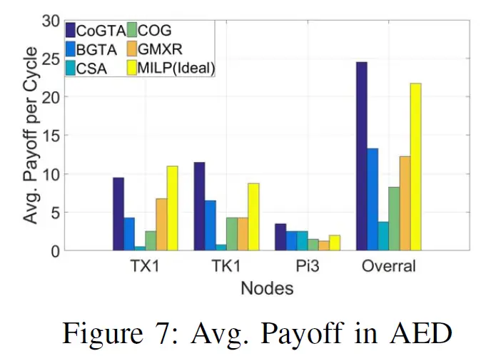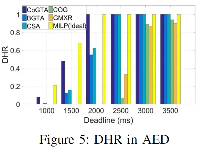 CoGTA的DHR比其他都高(除了MILP,作为性能上界),并且是第一个达到100%的。这归因于截止期限驱使的动态激励调整机制,它引导边缘设备的决策向着最小截止日期miss率。