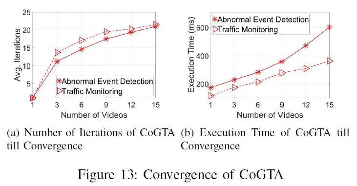 由13(a)可知CoGTA相对快速就可以找到纳什均衡。13(b)的执行时间包含DFPN的运行时间和设备与边缘服务器之间的通信时间。发现CoGTA的执行时间随着边缘设备的增加线性增长,但仍适用于延迟敏感的设备。