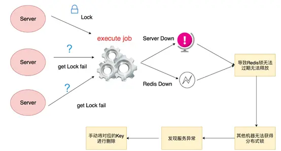 - 程序刚获取到锁还没有释放,服务器宕机,会导致锁无法释放,其他服务端永远获取不到锁。