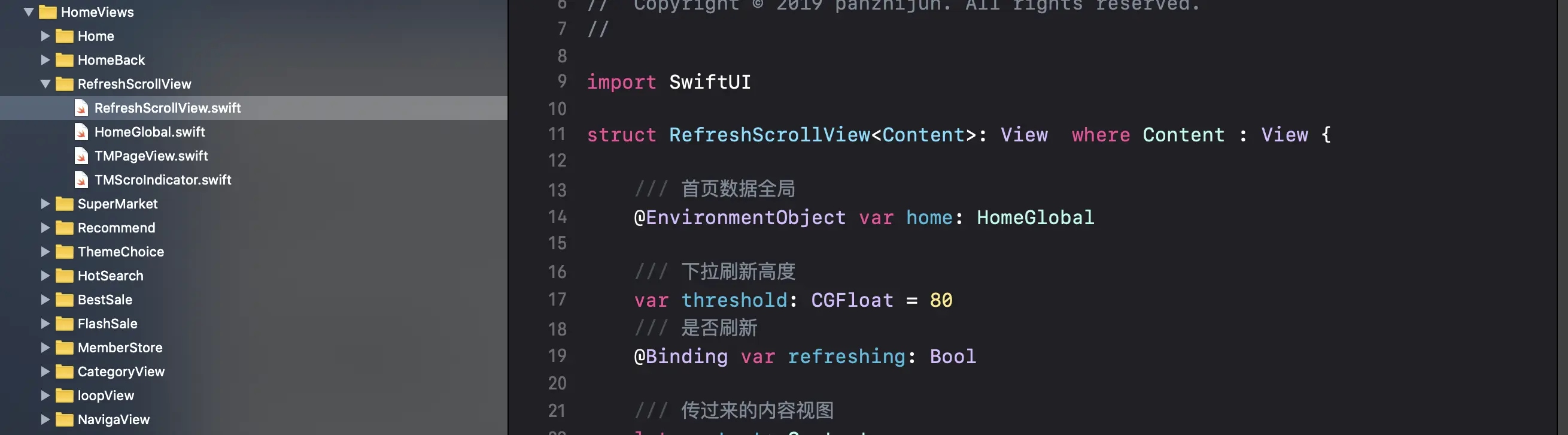 因为我们在使用中发现,SwiftUI中的ScrollView不在跟UIKit中的UIScrollView一样有代理方法,可以监听ScrollView的滚动事件。我们使用ScrollView(.vertical, showsIndicators: false)发现也只有设置横屏竖屏滚动,和是否显示滚动条的参数。这里好像SwiftUI中已经没有像UIKit中代理的一些东西了。在官网例子中也没有找到对应的实现,官网的例子中都是很简单的教你如何使用SwiftUI。在翻看gitHub上的一些文章后,找寻到了如何自定义实现ScrollView的滚动和如果实现下拉刷新等功能。 我们下面实现的自定义ScrollView是根据老外写的文章编写的: