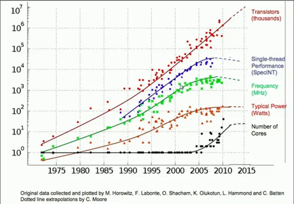 英特尔公司在 2004 年推出了第一款具有 3.0 GHz时钟速度的奔腾 4 处理器。如今,我的 2016款 MacBook Pro 的时钟速度为 2.9 GHz。因此,差不多十年,原始处理能力都没有太多的增加。你可以在下图中看到处理能力的增长与时间的关系。