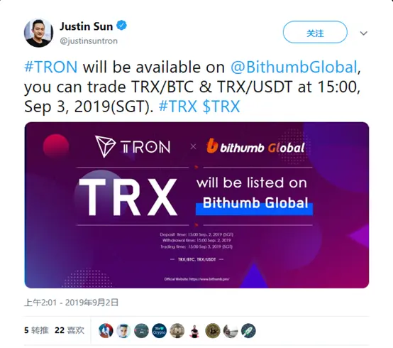 9月3日,全球三大公链之一波场TRON (TRX)、世界最大的去中心化文件分享协议之一BitTorrent(BTT)、基于TRON区块链的去中心化、安全、透明的游戏开发平台WINK(WIN)将正式登陆Bithumb Global主板进行交易,并将开通TRX/USDT、RX/BTC、BTT/USDT、WIN/USDT等交易对。