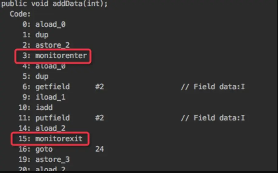 首先我们反编译synchronized使用中给出的示例的代码如下图所示,其中标注出了monitorenter和monitorexit两个字节码指令,这两个指令都需要一个reference类型的参数来指明要锁定和解锁的对象。