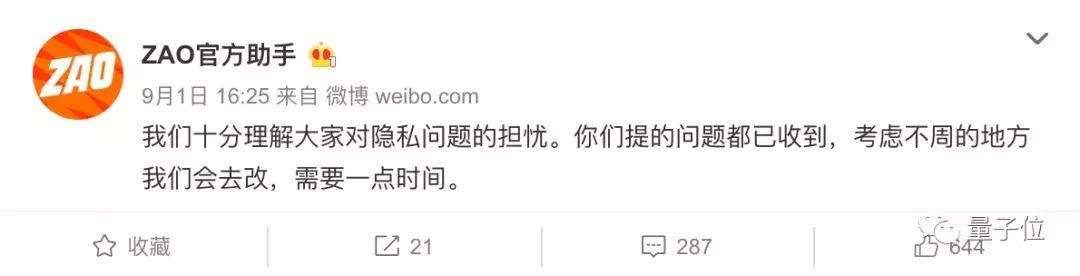 同样是在昨天,ZAO官方回应会就用户隐私问题进行修改。