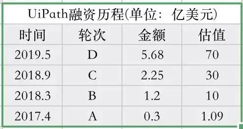 美国RPA龙头UiPath公司2017年估值“仅为”1.09亿美元,到2019年,估值已升至70亿美元,2年时间,该公司估值飙涨64倍。