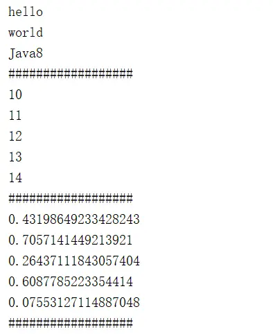 在上面的例子中,Stream.of()方法的参数是几个字符串,Stream.iterate()方法的第一个参数是初始值 10,第二个参数是在10 的基础上每次加 1 的操作,Stream.generate()的参数是用 Random 方法产生随机数。
