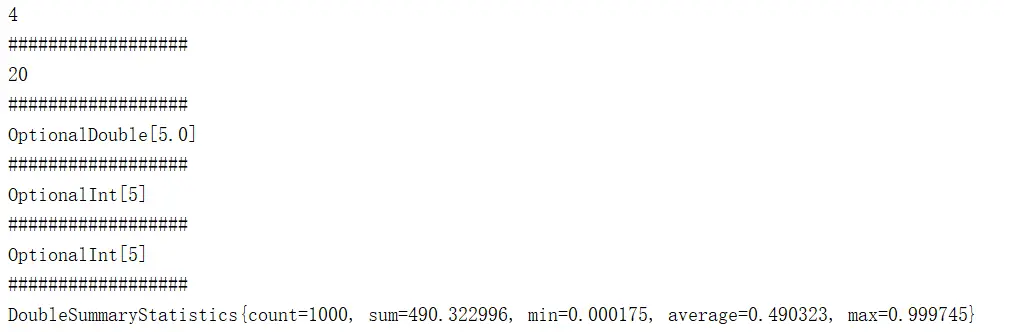 基本类型流都有内置的规约操作。包括average、count、max、min、sum、summaryStatistics,前面的几个方法相信不用说了,summaryStatistics 方法是前面的几个方法的结合,下面我们看看他们如何使用。
