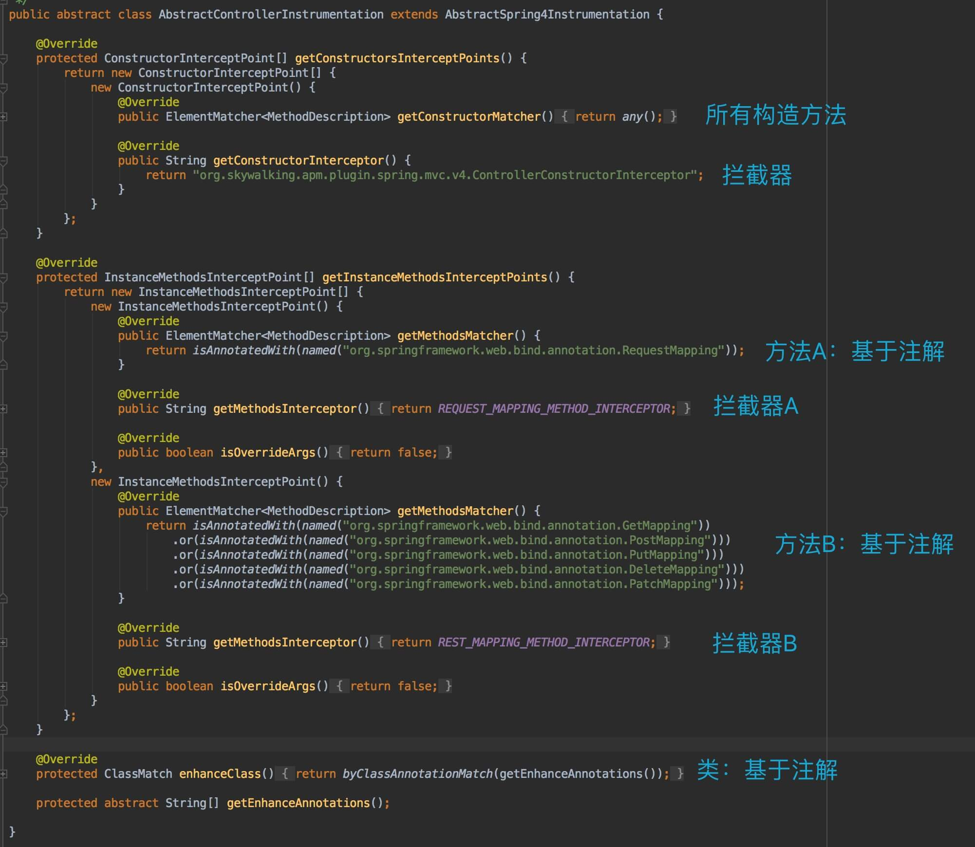 org.skywalking.apm.plugin.spring.mvc.v4.define.AbstractControllerInstrumentation ,实现 AbstractSpring4Instrumentation 抽象类,定义了方法切面,代码如下: