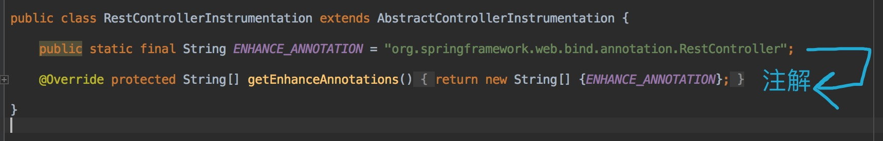AbstractControllerInstrumentation 是一个抽象基类,有 「 4.5 ControllerInstrumentation 」 ,「 4.6 RestControllerInstrumentation 」 两个子类,实现 #getEnhanceAnnotations() 抽象方法,返回不同的类注解,从而拦截不同的类。