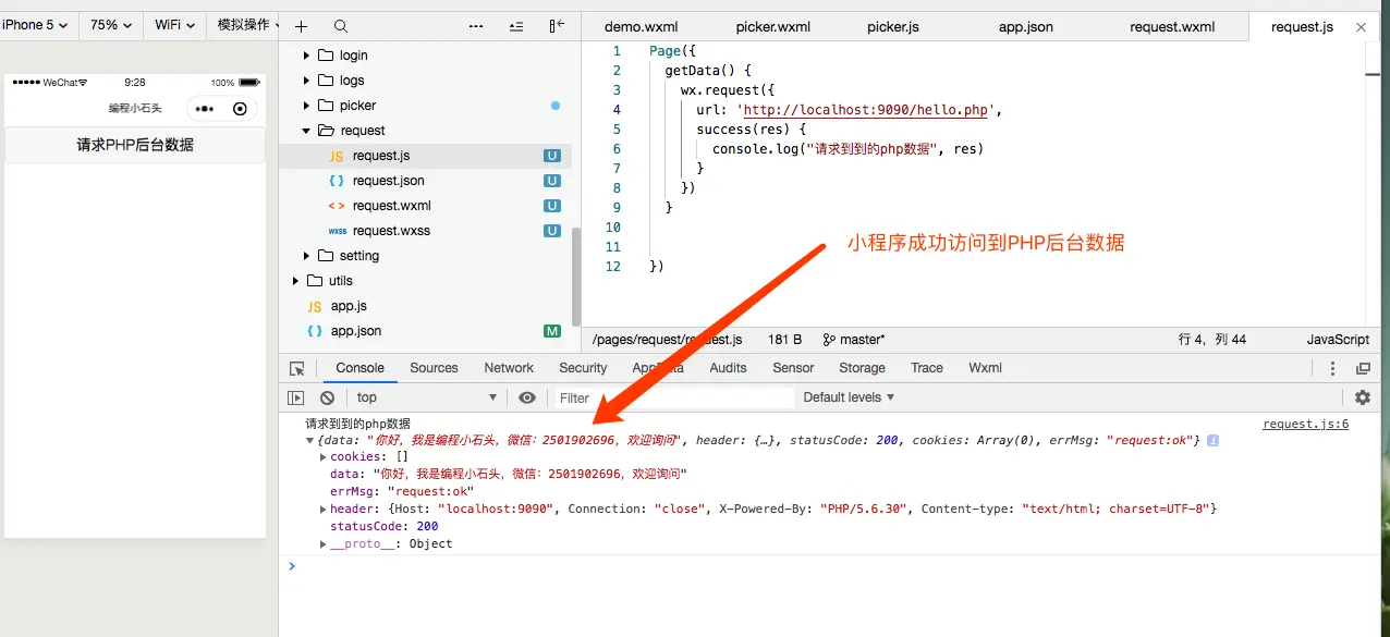 通过效果图我们可以看出来,我们的小程序可以成功的访问到我们的后台数据,而这个后台就是用PHP搭建的一个本地服务器。