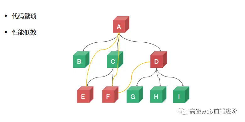 A节点要访问E子组件的实例,通过this.parent层层递归上一级查找父级实例,但是这样递归的方式代码非常繁琐,包括性能也非常低效。