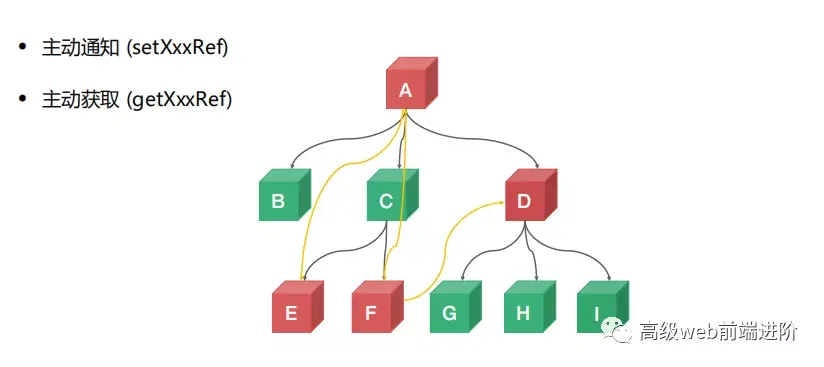 - 主动获取:子组件主动通知父组件后,父组件进行缓存子组件的实例,当子组件与子组件需要互相访问实例的时候,直接调用父组件已缓存的对应的子组件实例