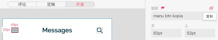 选中某个图层后,属性面板右上角点击“复制”。此时关于该图层的所有属性会以JSON格式复制在剪切板中,可直接投入开发。以往可能需要5分钟写图层的一串属性,现在1分钟内搞定!