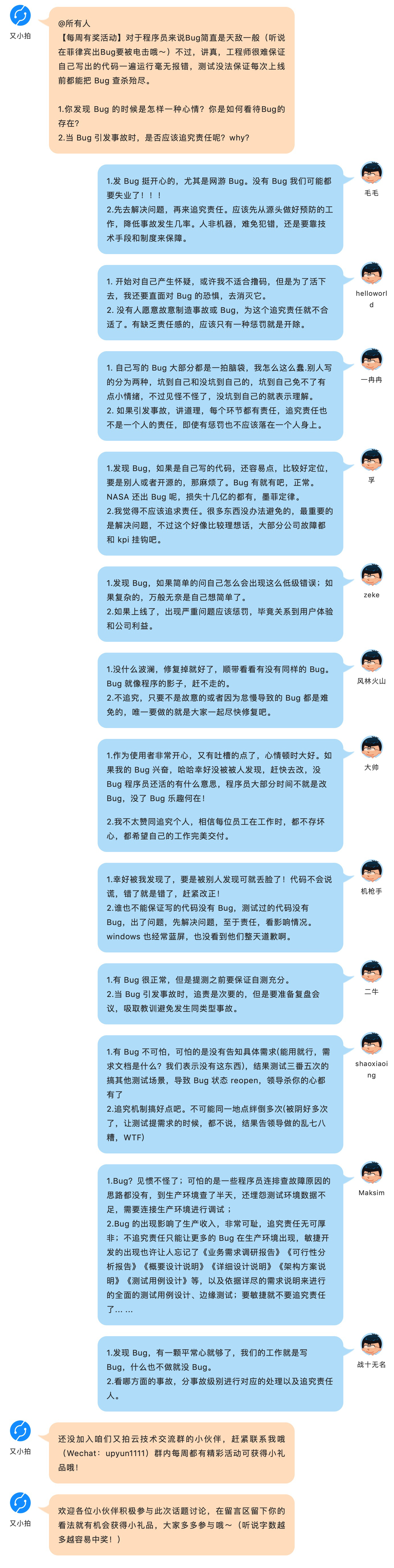 【社群话题分享】当 Bug 引发事故时,是否应该追究责任呢? 又拍云技术团队 2019-09-03 190 阅读1分钟 关注 运维 @又拍云 每周三下午的话题活动是又拍云技术社群的优良传统~ 大家一起来看看这周都聊了些啥吧~(点击即可看大图哦) 看看之前大家还聊了些什么,点击下方你感兴趣的话题~ 【社群话题分享】__是世界上最___语言? 【社群话题分享】IDE 技术哪家强! 【社群话题分享】远程工具哪家强? 【社群话题分享】有哪些奇葩的技术人员考核方式? 【社群话题分享】程序员中年真这么难?