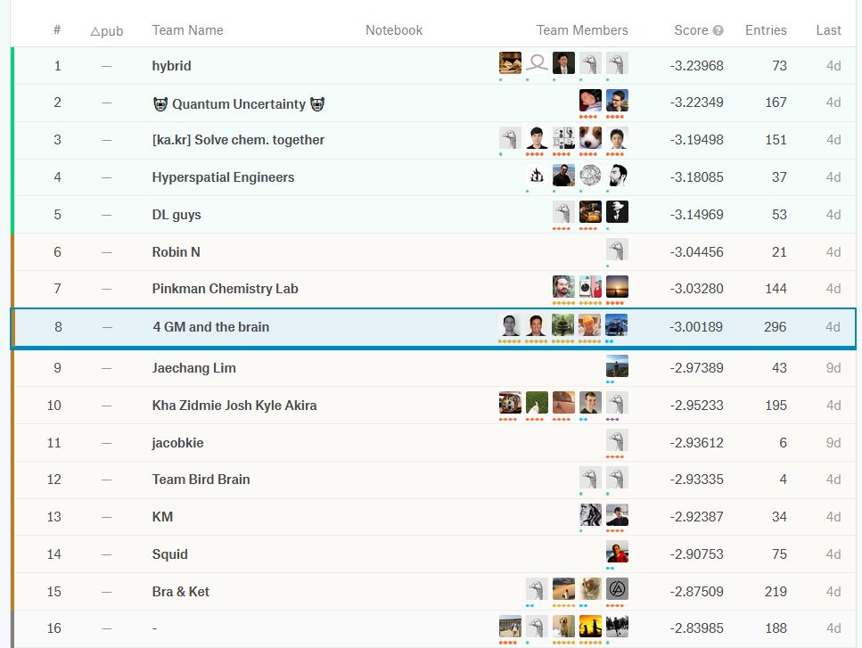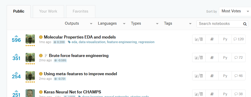合并方法 起初,我们的方法存在很大分歧。我用的是特征工程技术,而Boris则致力于创建描述符。一段时间之后,我们发现我的模型在一些原子对类型上表现更好,而他的模型在其他情况下表现更佳,因为我们为不同的类型训练了不同的模型。 幸运的是,Psilogram加入了我们的团队。没过多久,他的模型就表现出了优于我们模型的性能。另一名成员Bojan帮助我们进一步改进了结果。他们都是很棒的机器学习专家。