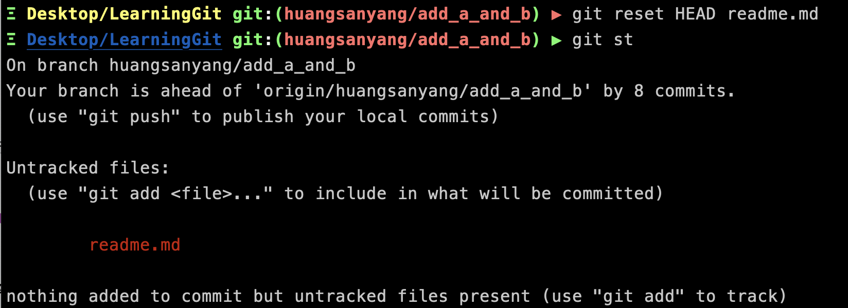 那如果这时候不想提交这个文件,我们可以将其 reset 到 add 的状态。