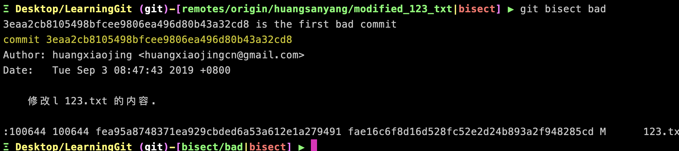 如果执行了, 就会将当前的 HEAD 执行中间的一次结果。这个时候你就可以通过查看当前的版本是否有问题,如果没有问题就执行 git bisect good, 这个就会将 HEAD 指向新的提交。