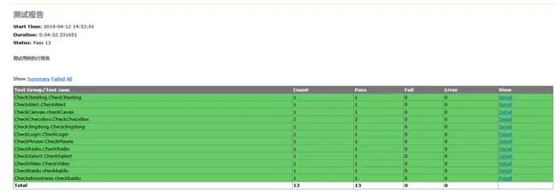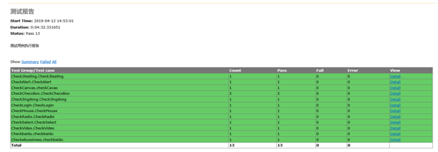 在这里所有测试用例的文件名都定义为Check*.py,比如:CheckBaidu.py。运行这个文件,符合条件的当前目录下所有文件名以Check开始的py文件将会被执行,执行完毕形成result.html测试报告。测试报告如图所示。