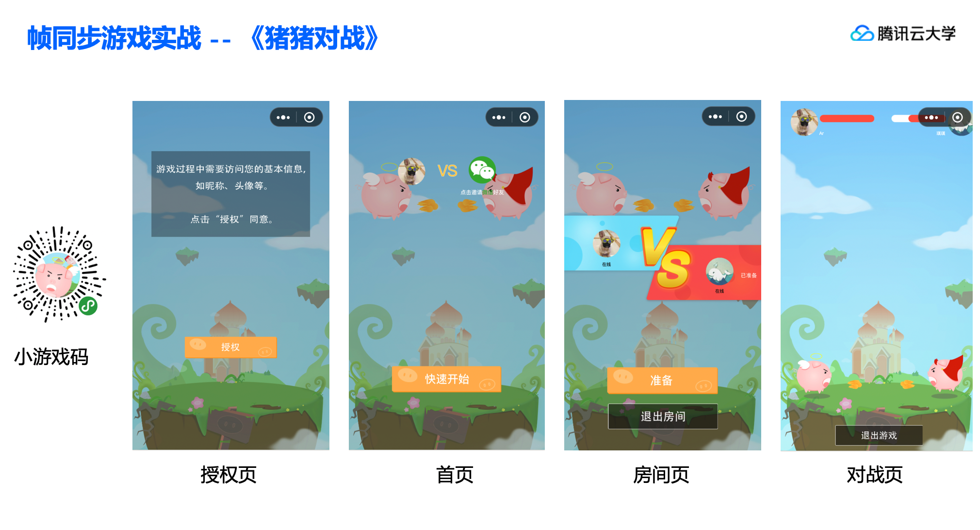 猪猪对战demo是一款1V1的双人对战帧同步游戏,玩家可以通过邀请好友或者快速加房组成对局,然后使用帧同步实现不同玩家之间游戏逻辑的同步。demo包含四个页面,分别是授权页、首页、房间页、对战页。玩家进入首页后,点击“快速开始”或者“邀请好友”按钮进入房间页;双方点击房间页“准备按钮”后可以进入对战页面开始游戏。