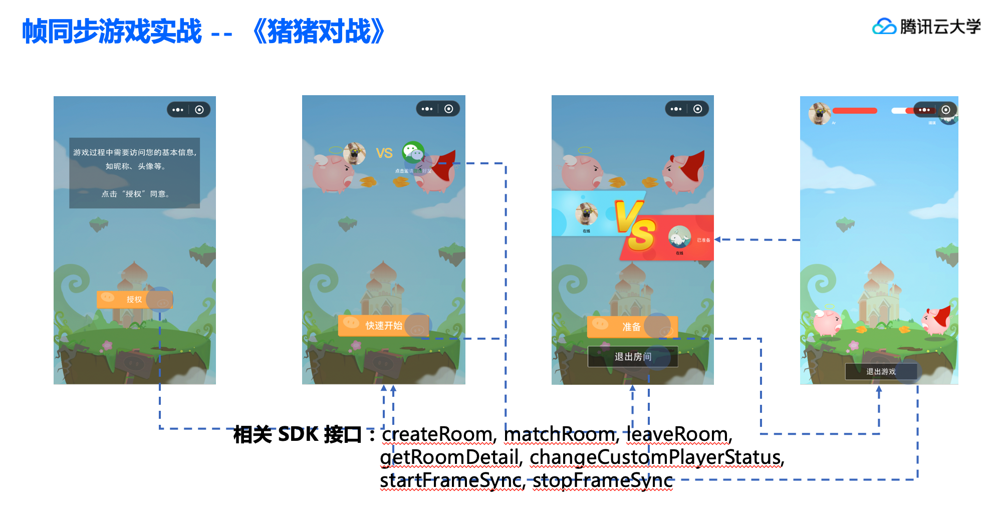 涉及到的MGOBE接口有房间匹配(matchRoom)、创建房间(createRoom)、加入房间(joinRoom)、查询房间信息(getRoomDetail)、退出房间(leaveRoom)、修改玩家状态(changeCustomPlayerStatus)、开始帧同步(startFrameSync)、帧同步广播(onRecvFrame)。