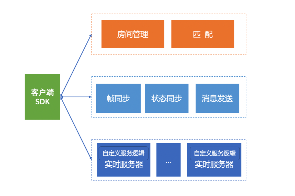 状态同步类型联机游戏的特点是游戏逻辑状态在服务端计算。为了实现状态同步,MGOBE 为开发者提供了实时服务器功能,开发者可以上传代码部署到实时服务器上,并且与客户端 SDK、房间服务进行交互。