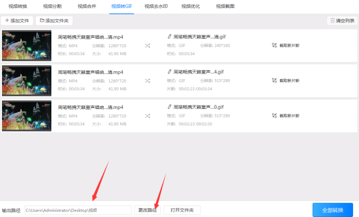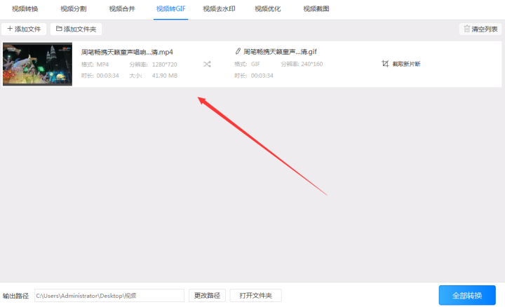 5、根据设置好的片段点击转换gif或全部转换按钮把添加好的视频根据设定的参数转换成gif动态图。