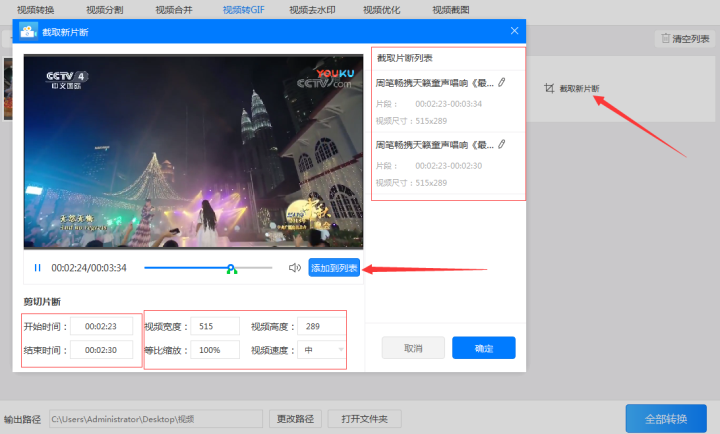 3、点击“截取新片段”针对视频要转换片段进行调整(开始/结束时间、视频宽度/高度以及播放速度)。