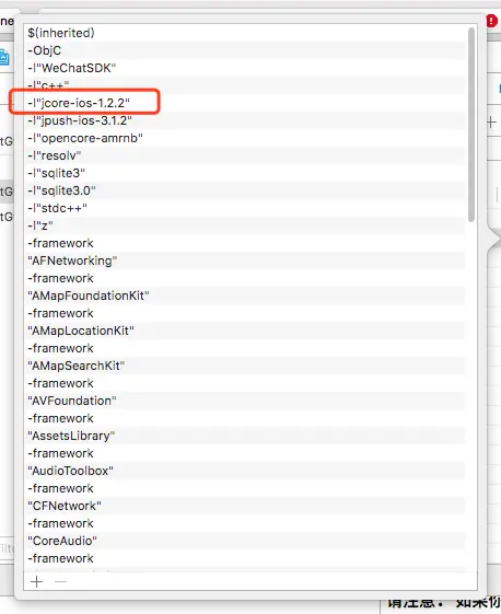 可以看到我们错误里出现的库-ljcore-ios-1.2.2,我们只需要将这个库改成我们更新后的第三方库中的版本即可。比如我更新了极光,他的 ljcore 库版本变更为1.2.6,那么我们将这里的-ljcore-ios-1.2.2改成-ljcore-ios-1.2.6即可。