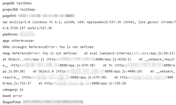 e.g: 下图是当使用了未定义的变量"foo",导致产生js运行时错误时的上报数据: