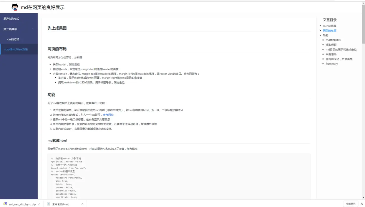 点击左侧的菜单,可以获取到相应的md内容(字符串格式),将md内容转成html,为一级、二级标题加锚点id