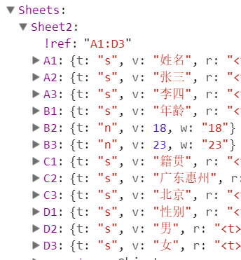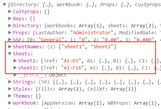 可以看到,SheetNames里面保存了所有的sheet名字,然后Sheets则保存了每个sheet的具体内容(我们称之为Sheet Object)。每一个sheet是通过类似A1这样的键值保存每个单元格的内容,我们称之为单元格对象(Cell Object):