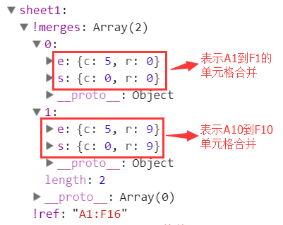 sheet[!merges]:存放一些单元格合并信息,是一个数组,每个数组由包含s和e构成的对象组成,s表示开始,e表示结束,r表示行,c表示列;