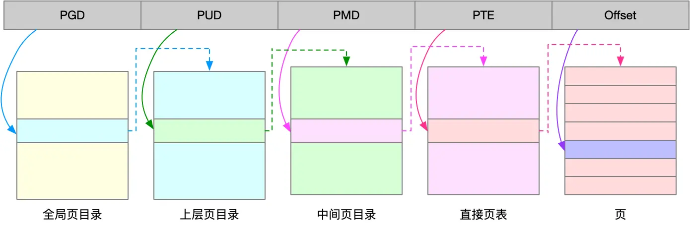 linux用的是四级页表来管理内存页,虚拟地址被分成5分部分,前4个表项用于选择页,而最后一个索引表示页内偏移。