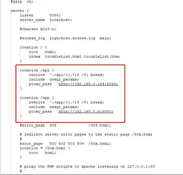 server_name 是本地访问的端口这里项目启动的方式决定了我们代理的端口我们使用ip访问就需要配置一下这里的地址